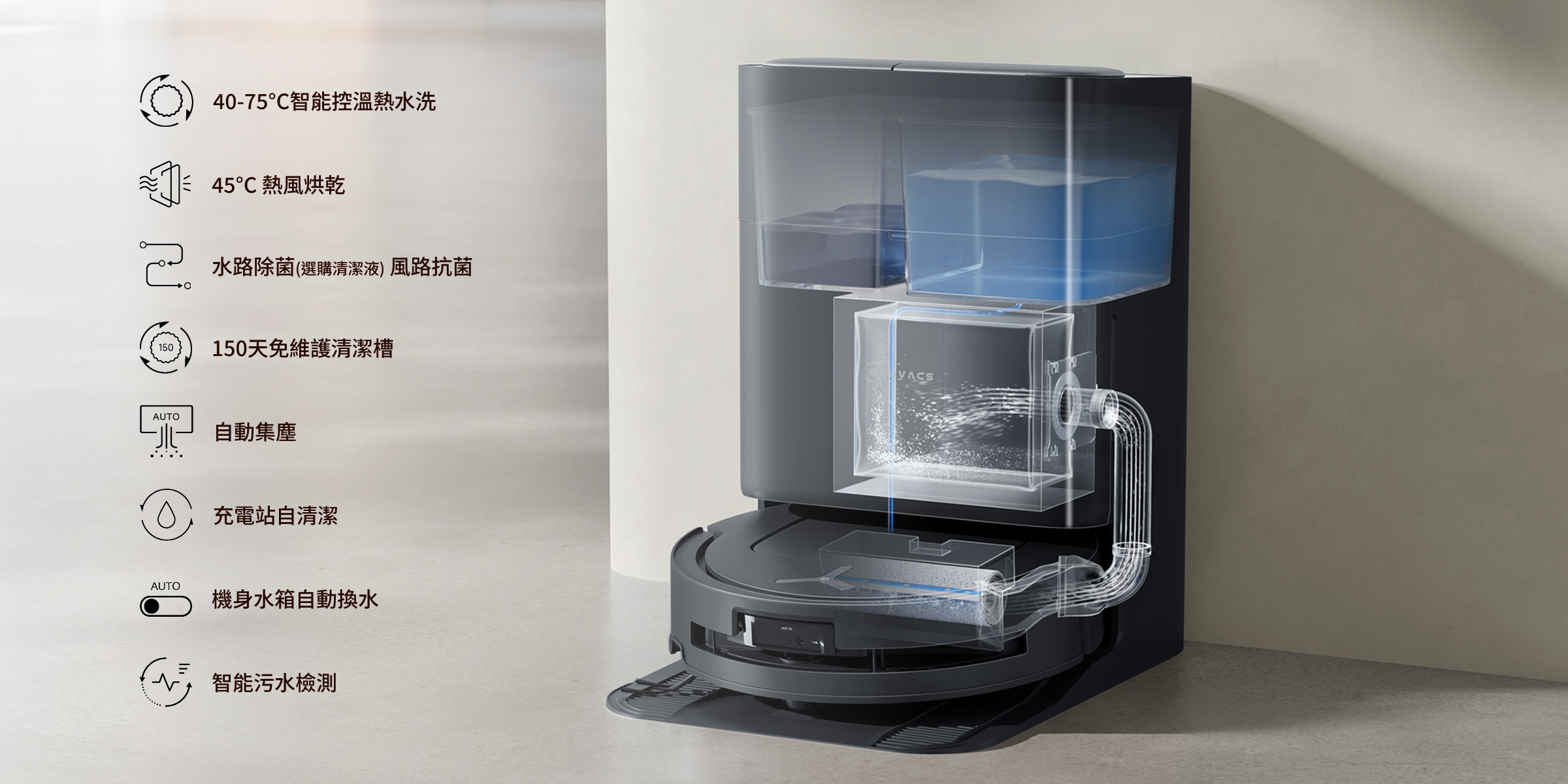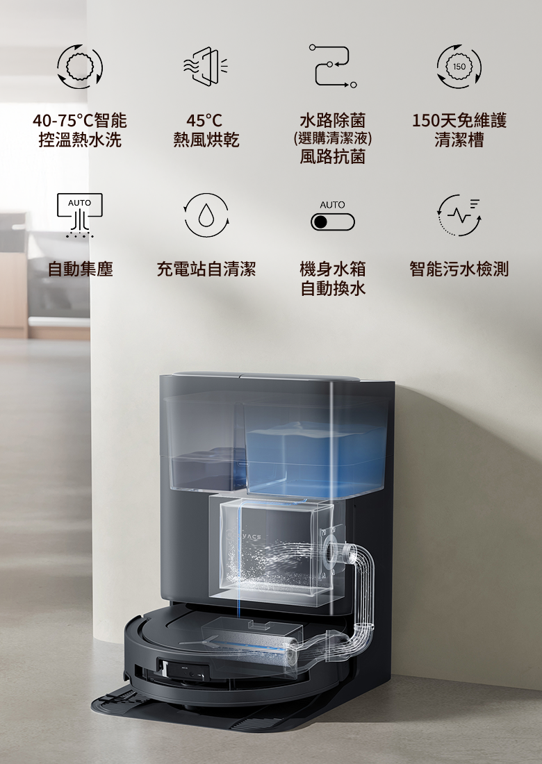 - "Full-link sterilization": Users are required to introduce Ecovacs cleaning and disinfection liquid into a specific area to achieve this function. The specific details are subject to actual household use.