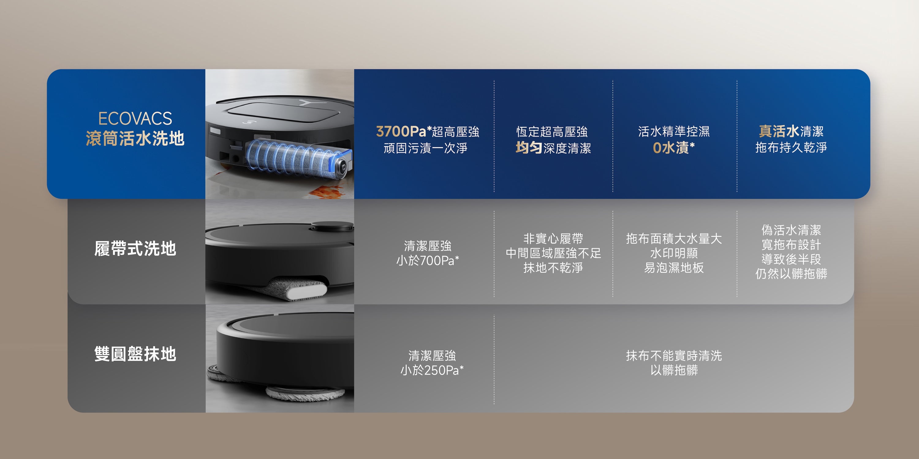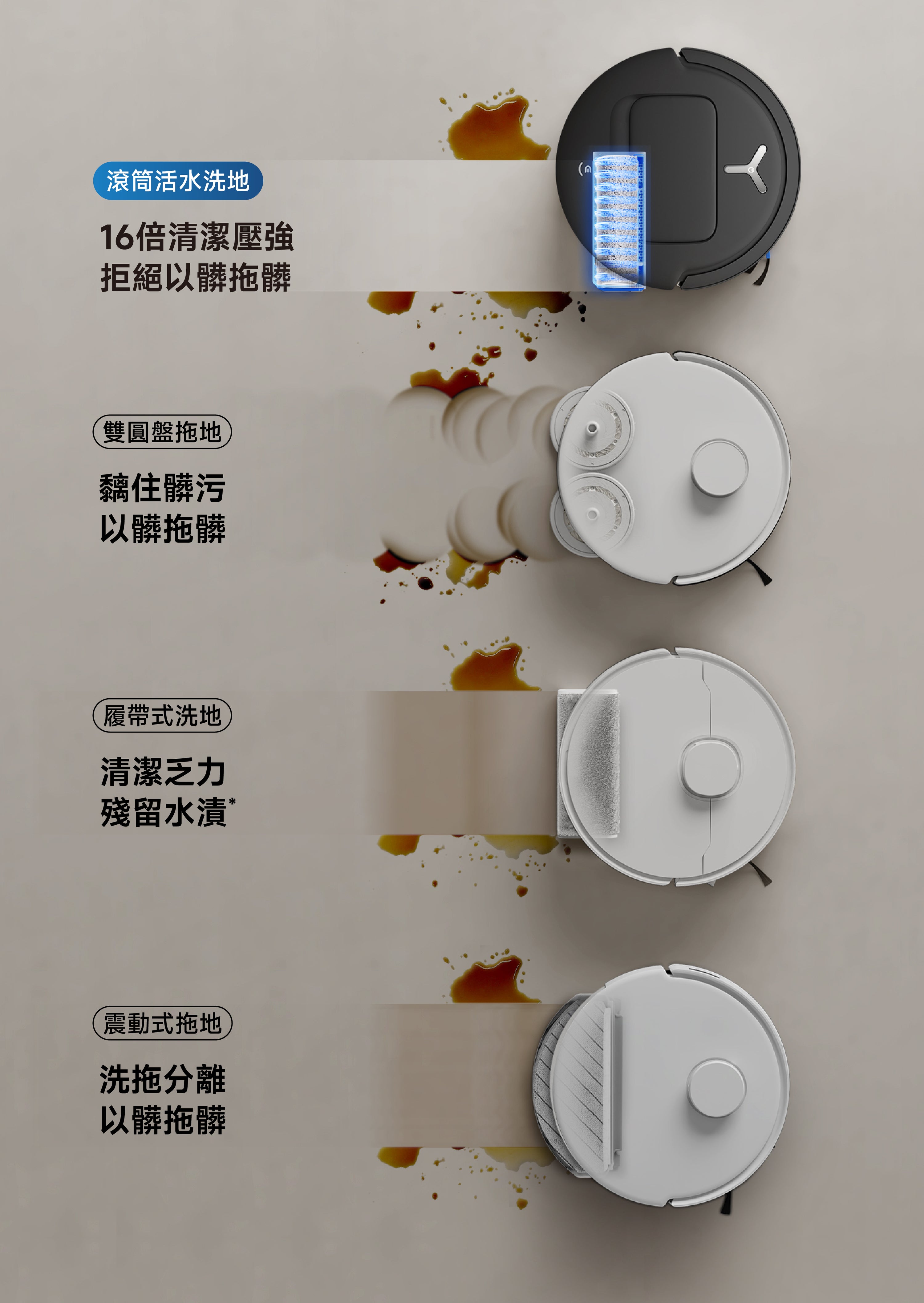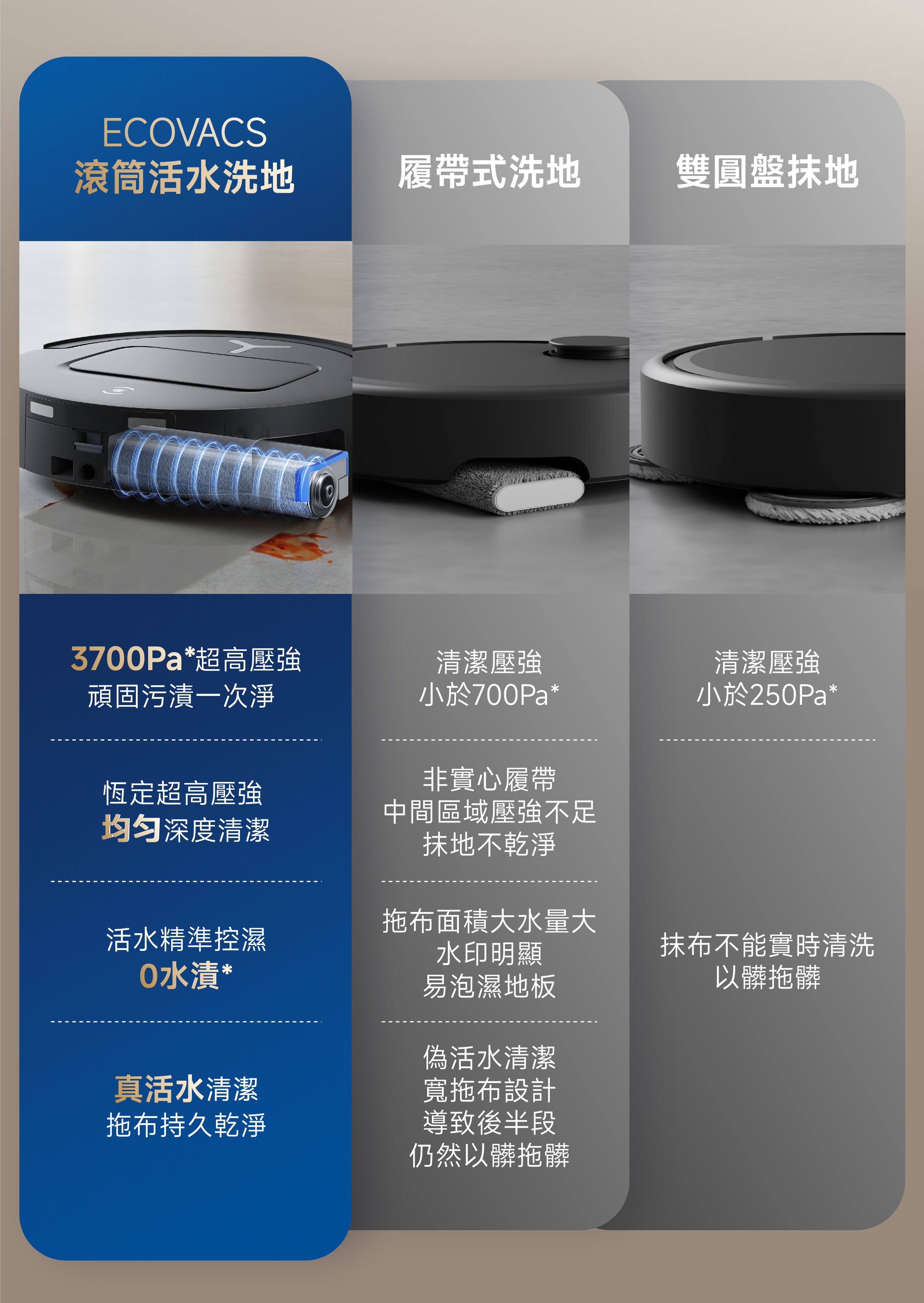 - "16 times the cleaning pressure" means that the cleaning pressure of the Ecovacs DEEBOT T80 drum series products is 16 times that of the double-disc cleaning pressure. The data comes from the Ecovacs laboratory and is subject to actual household use.