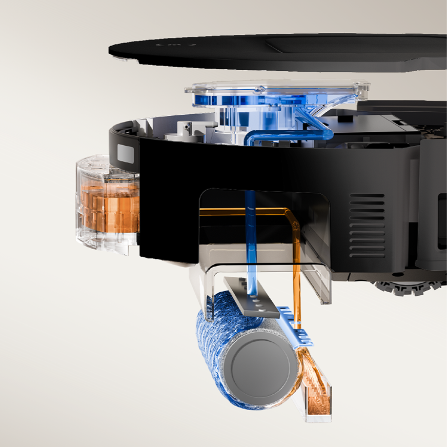 - "Live water" means that the T80 series products can use the built-in dynamic water flow spray of the drum cleaning module to spray the water in the built-in clean water tank of the main unit onto the drum mop continuously. In addition, the dirty water on the dirty surface of the mop will be squeezed through the wiper bar and recycled into the main unit's sewage tank. This ensures that the water used in the mopping process is clean and the actual water is used.