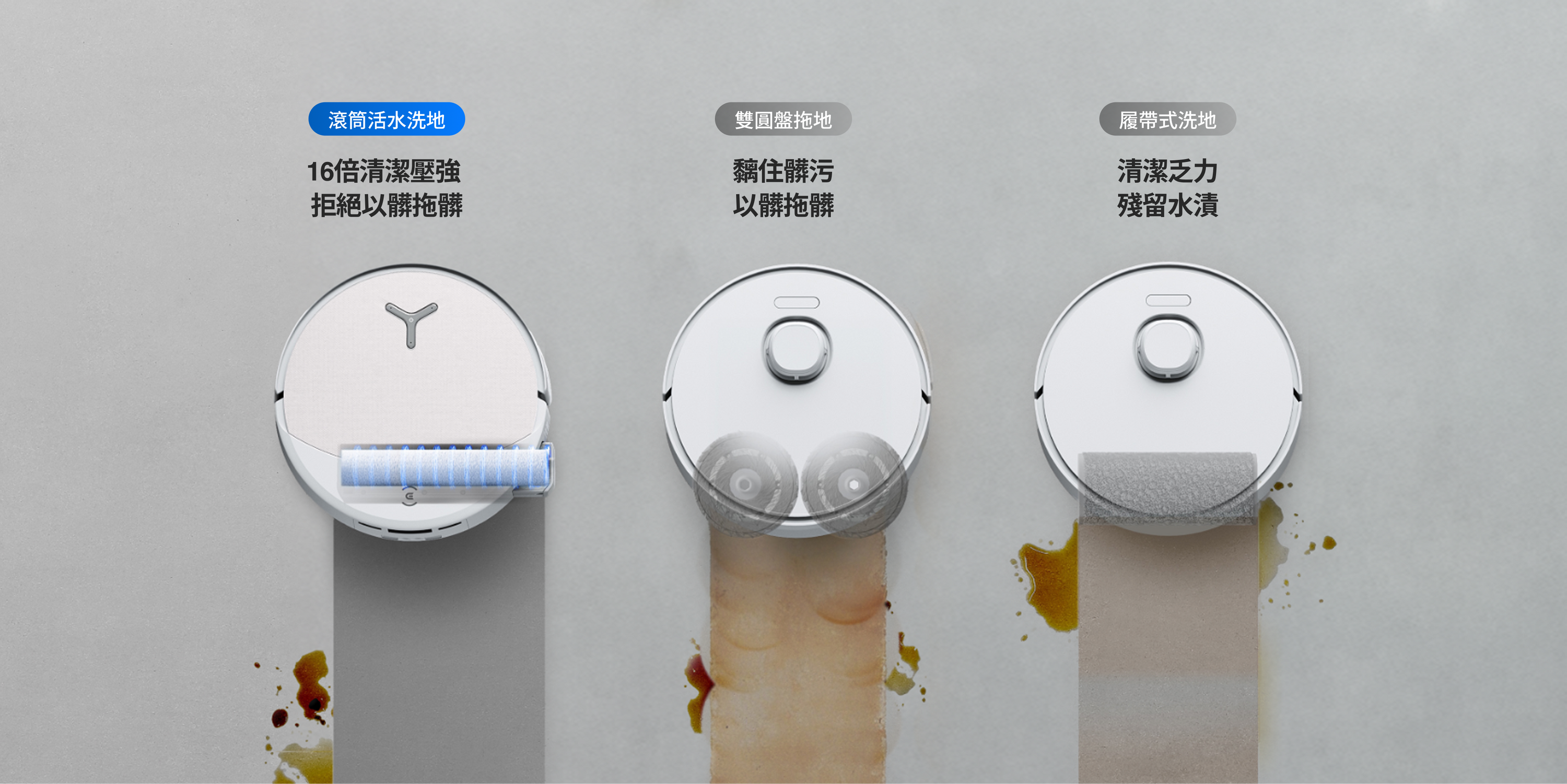 洗地同時即時高壓沖淋滾筒並徹底去除污垢,比傳統滴淋式洗得更乾淨,真正杜絕「以髒拖髒」。