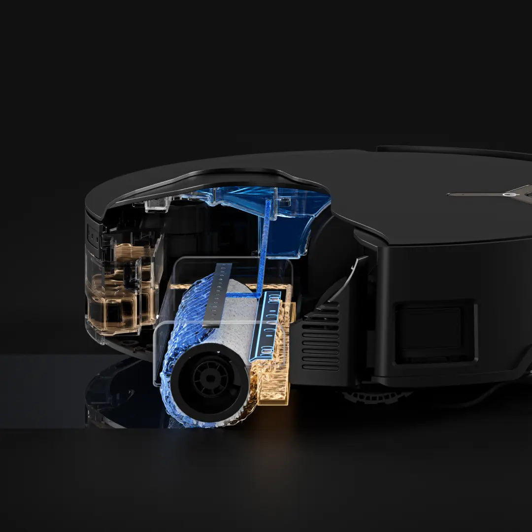 - "The world's first constant pressure live water floor cleaning robot" means that the X8 series of products introduced the "constant pressure" and "live water" cleaning functions for the first time in all Ecovacs product series worldwide. This description is based on Ecovacs' internal product innovation, rather than a comparison with all similar products on the market. "Constant pressure" refers to the fact that the drum cleaning module of the X8 PRO series products is equipped with a floating constant pressure wiper strip. The wiper strip can achieve constant pressure scraping close to the mop by floating up and down. "Live water" means that the X8 series products can use the dynamic water flow built into the drum cleaning module to spray the water in the built-in clean water tank of the main unit onto the drum mop continuously. In addition, the dirty water on the dirty surface of the mop will be squeezed through the wiper bar and recycled into the main unit's sewage tank, thus ensuring that the water used in the mopping process is clean. The specific details shall be subject to actual household use.