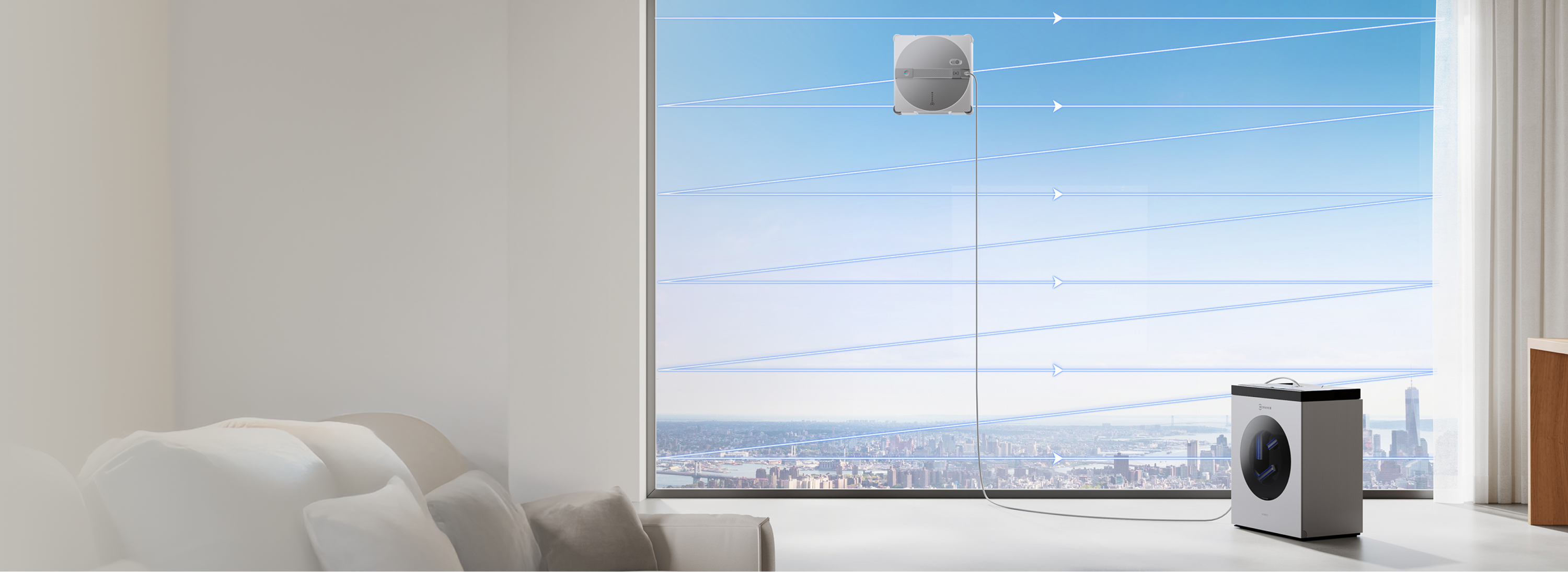 "100kg重物拉力":指ECOVACS WINBOT W3系列產品基站可承擔100kg拉力,如遇意外墜落,可在拉出1m後自動落鎖,數據源自ECOVACS實驗室,具體以家庭實際使用為準;