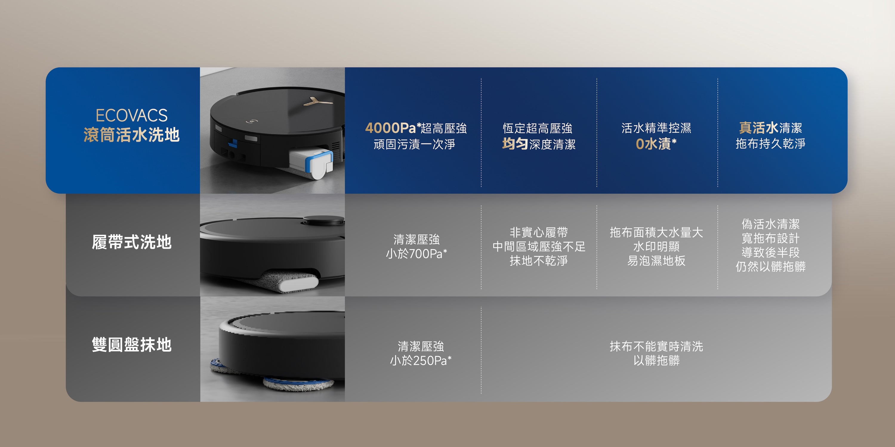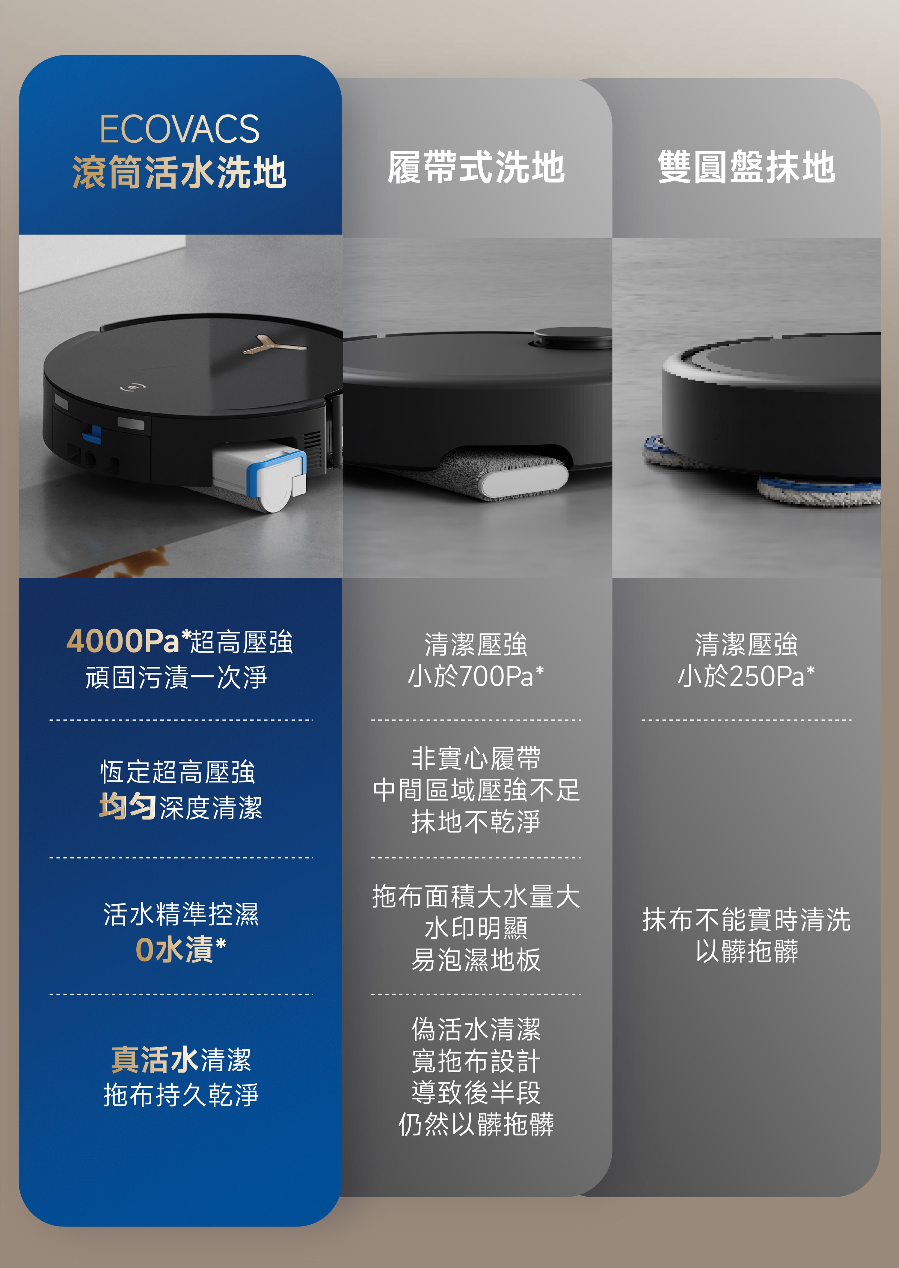 - "18倍清潔下壓力" 對比產品為ECOVACS過往雙圓盤式拖地機械人。